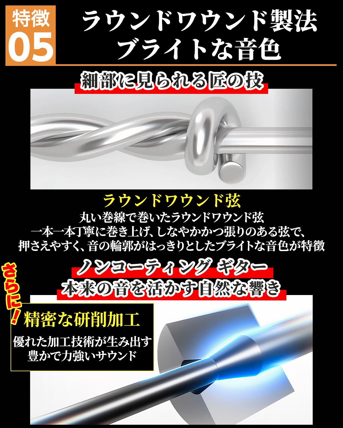 ・ラウンドワウンド製法で、ブライトな音色。職人の技。