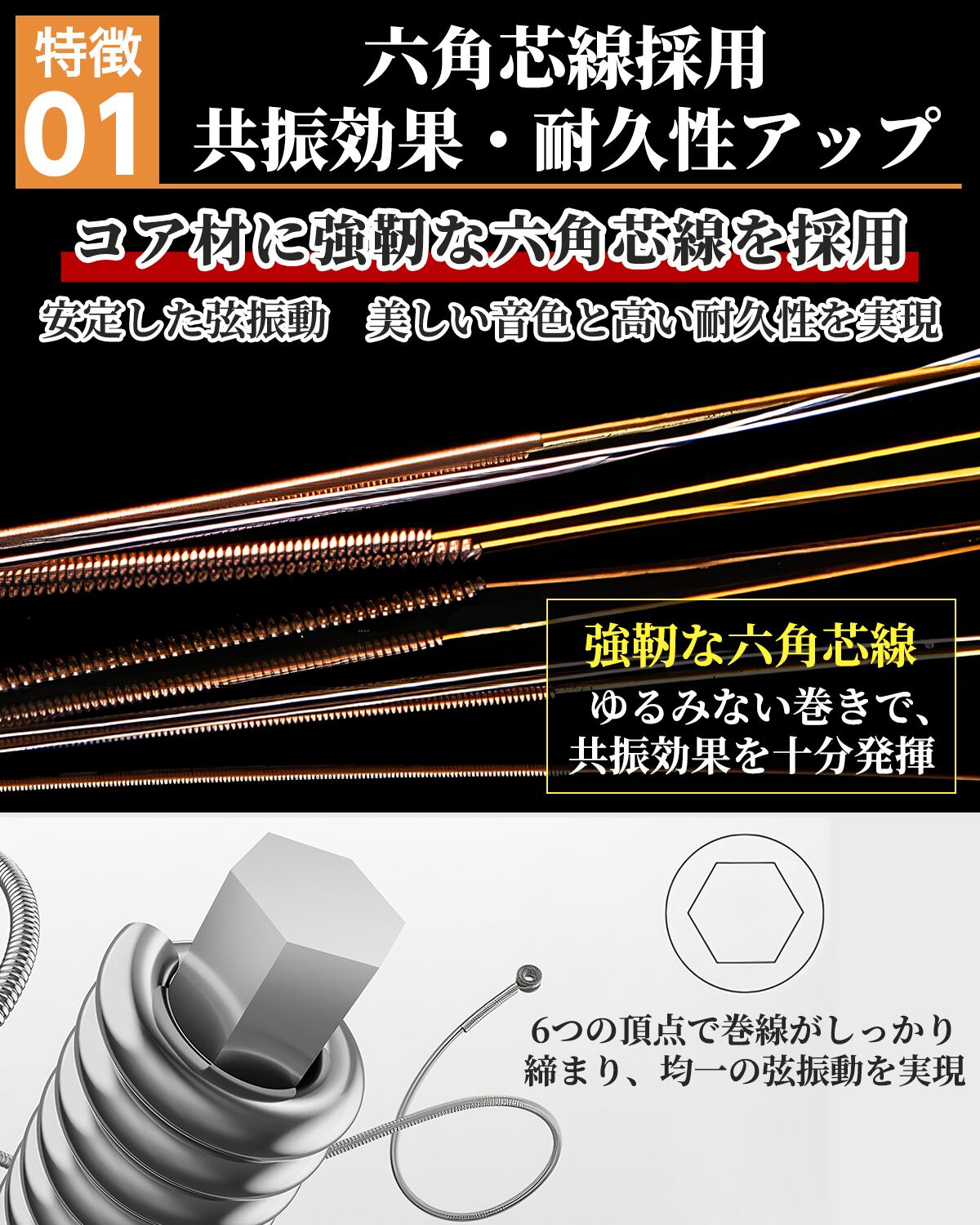 ・コア材に、六角芯線を採用。安定した弦振動、高い耐久性を実現。
