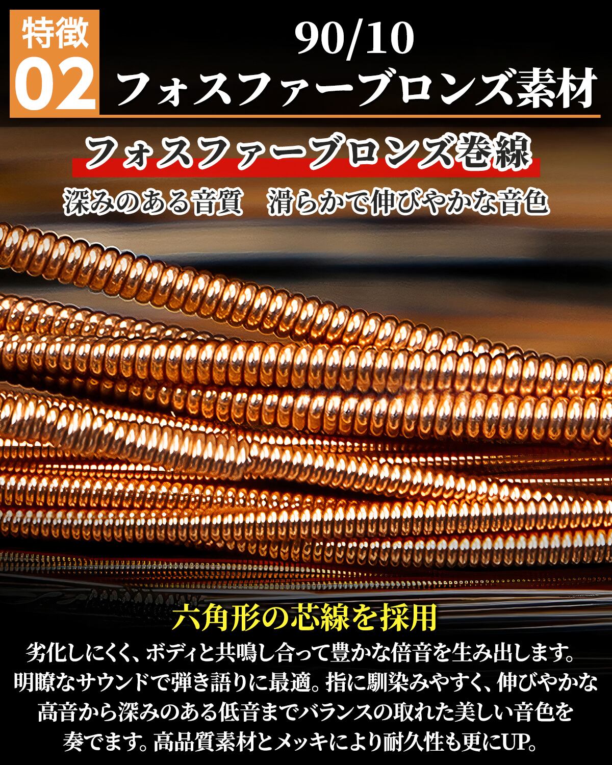 ・素材はフォスファーブロンズ/Phosphor Bronze採用で深みのある音質。なめらかで伸びやかな音色。