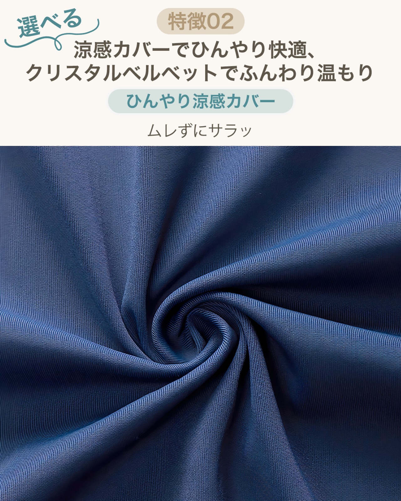 【選べるカバーで年中快適】 季節や好みに合わせて「涼感カバー」と「クリスタルベルベットカバー」の2種類から選べます。