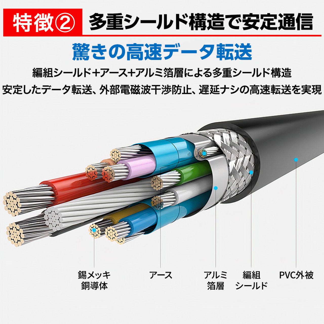 多重シールド構造と高耐久PVC素材で、ノイズや断線の心配もゼロ。