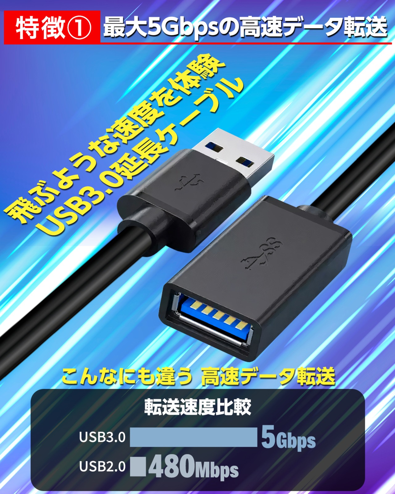 USB3.0規格対応で、最大5Gbpsの超高速データ転送を実現。