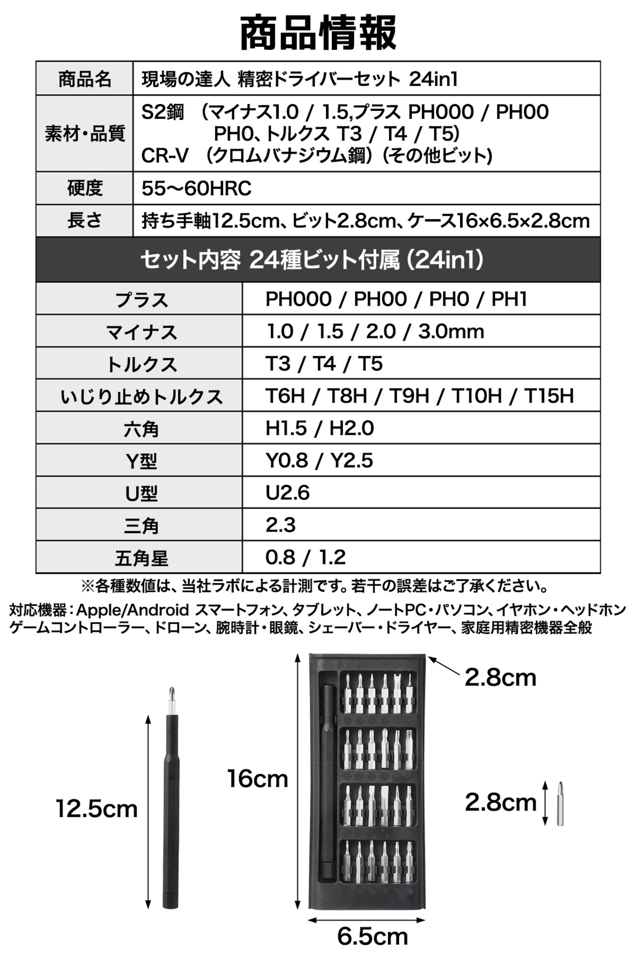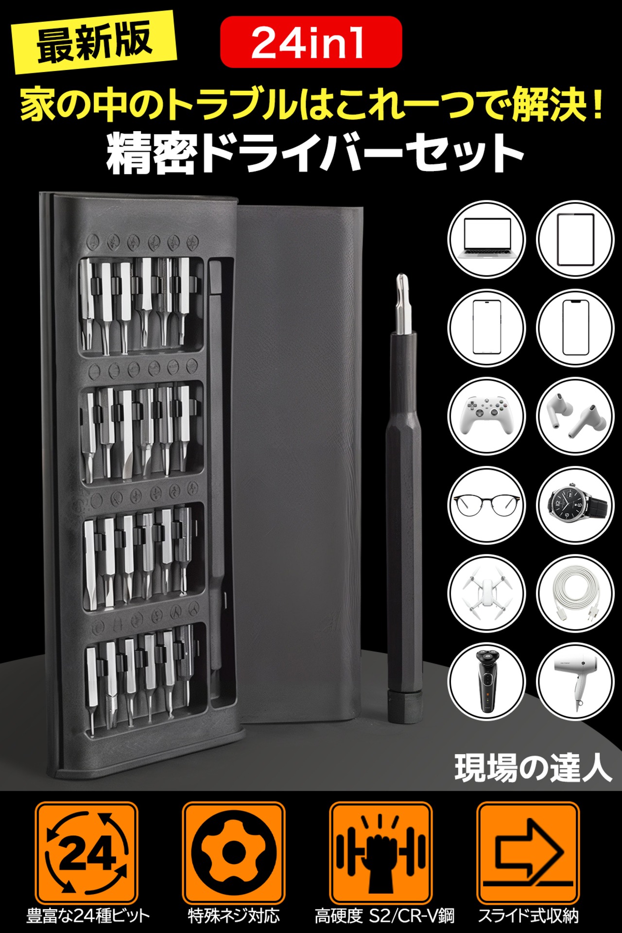精密ドライバーセット 24in1 現場の達人 精密ドライバー スマホ 修理 工具 セット 24種類 特殊ネジ対応 S2鋼 高硬度 ビット マグネット スライド式 ケース付 パソコン ノートPC iPhone Android 眼鏡 腕時計 分解 メンテナンス ゲーム機 DIY プロ仕様 ポッキリ