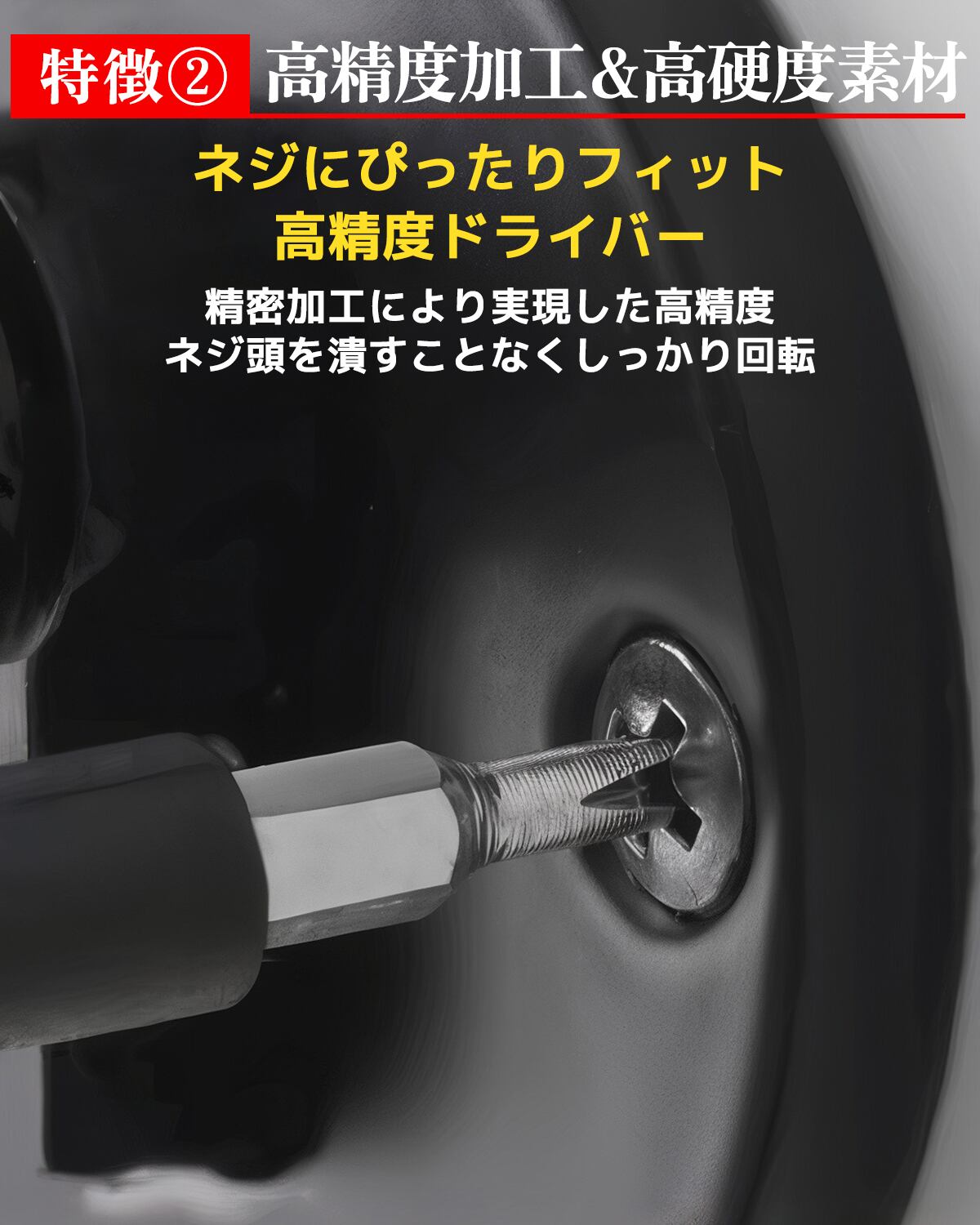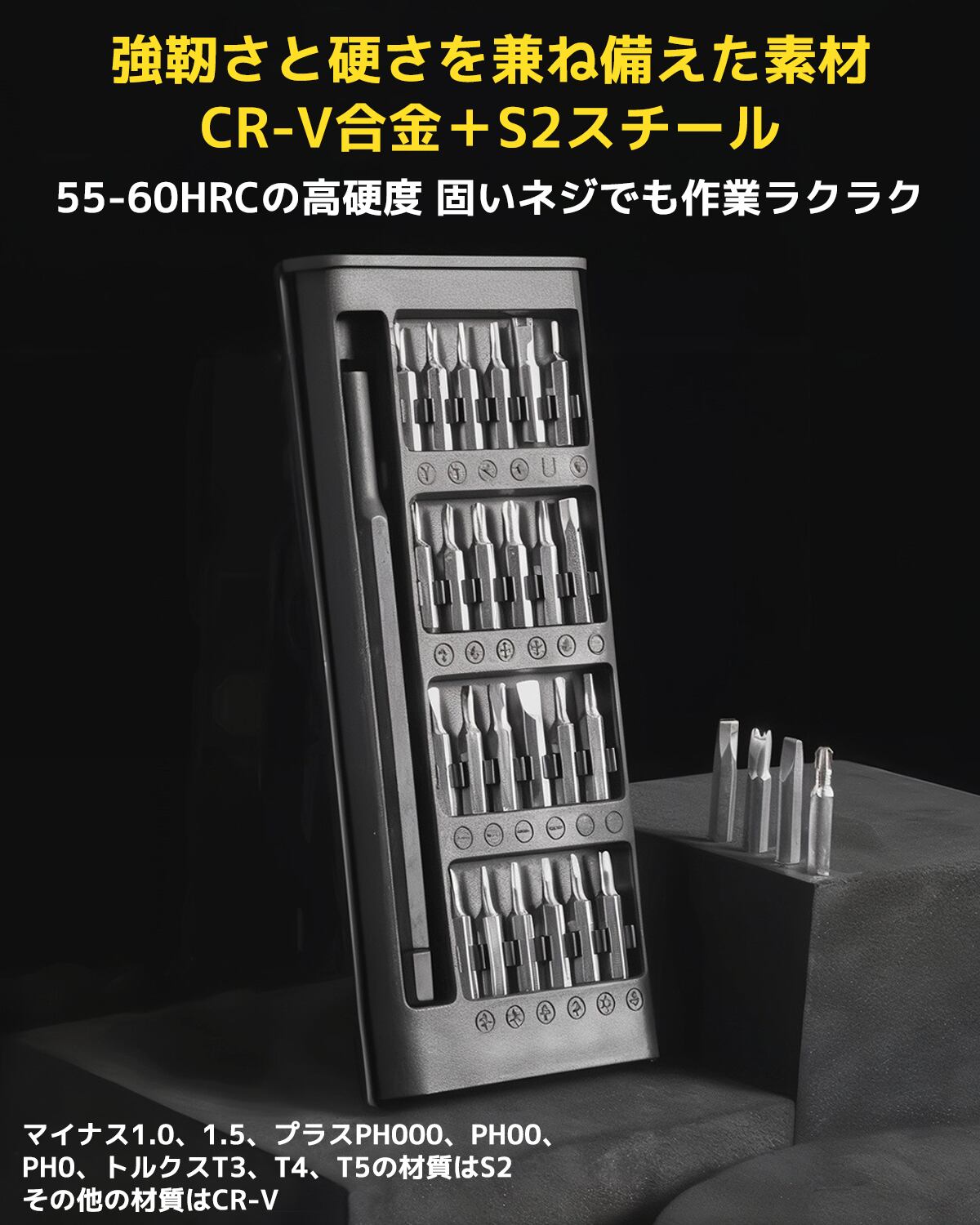 安価なセットはすべて同じ安価な金属で作られがちですが、本商品は負荷がかかりやすい極小ビット(プラスPH000やトルクスT3など)に、より強靭な「S2鋼」をピンポイントで使用しています。これにより、「一番使うビットからダメになる」という不満を解消。55-60HRCの高硬度で、固いネジでも頭を潰さず確実に回せます。