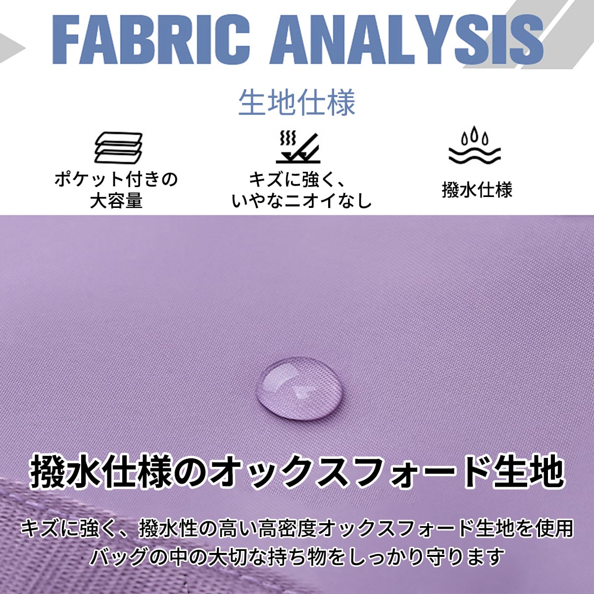 生地は撥水仕様のオックスフォード。キズにも強いから、収納した大切なアイテムをしっかり守ります。