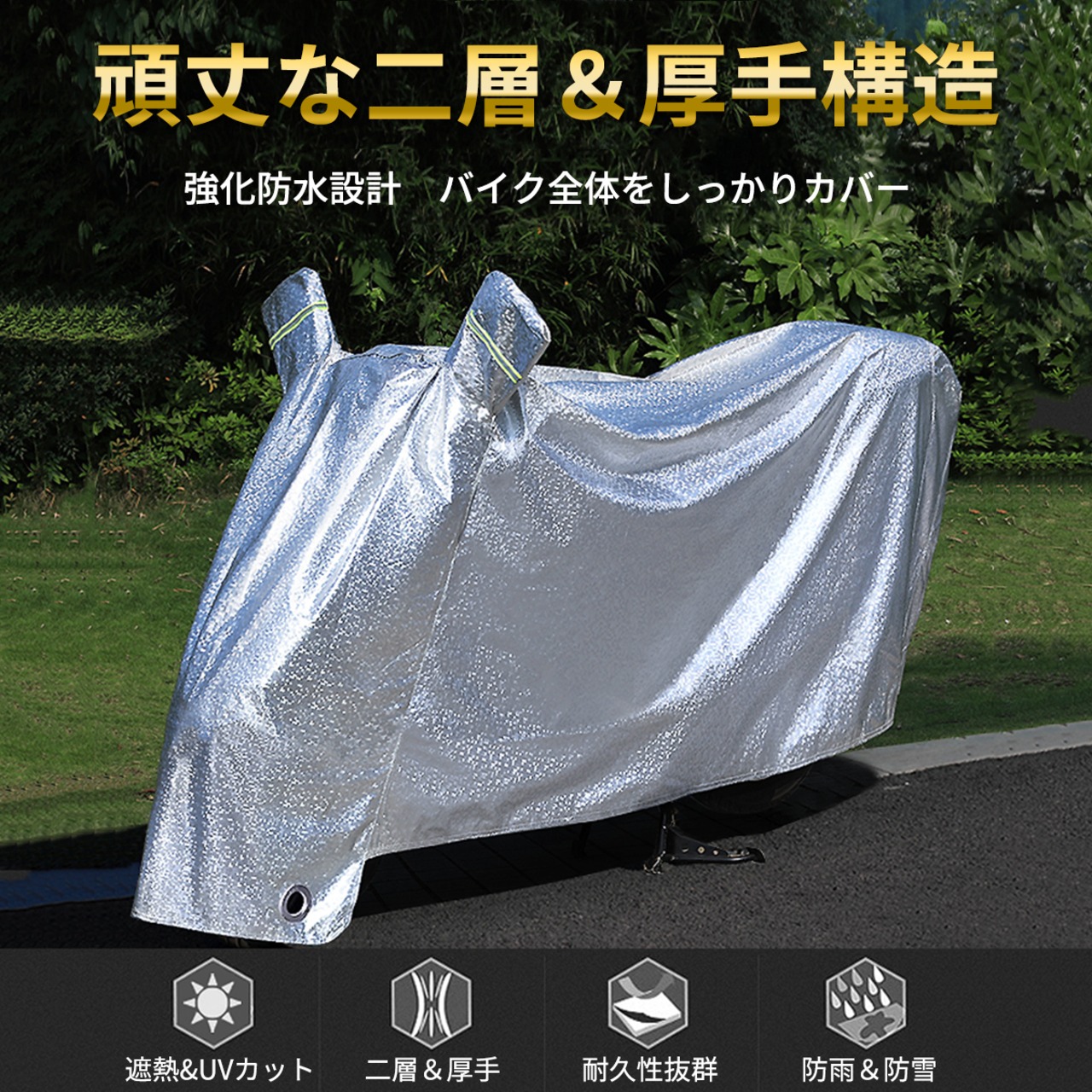 【お得】バイクカバー 原付 大型 厚手 耐熱 防水 ハーレー カバー 紫外線防止 盗難防止 溶けない 強化 UVカット 防雨 防雪 耐久性 二層 アルミ 光反射 ロック通し穴