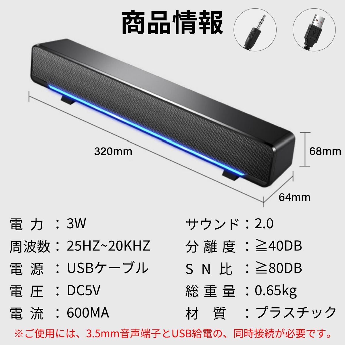 ※ご使用には、3.5mm音声端子とUSB給電の、同時接続が必要です。