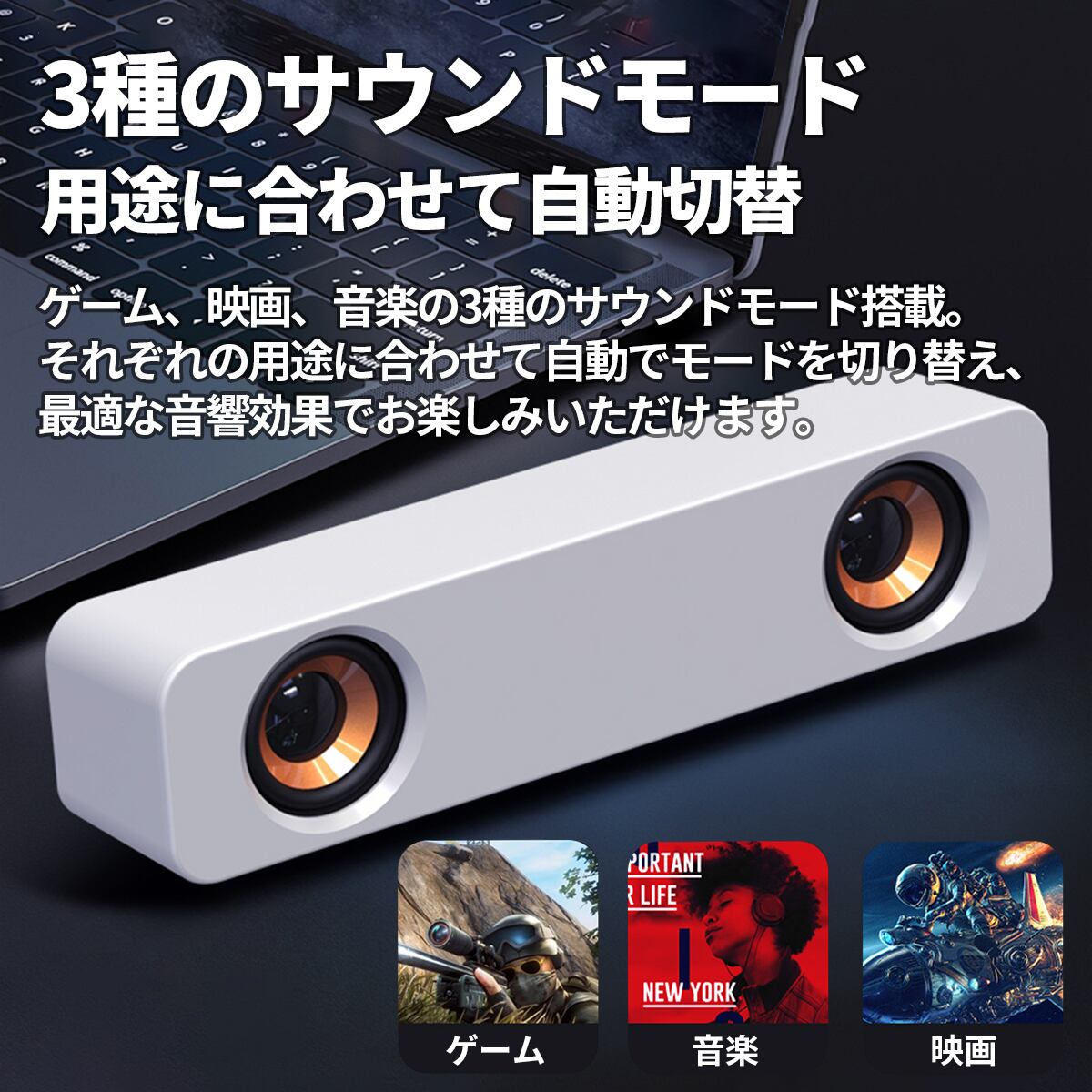 ゲーム、映画、音楽の3種のサウンドモードを搭載し、用途に合わせて自動でモード切替されるため、最適な音響効果でお楽しみいただけます。