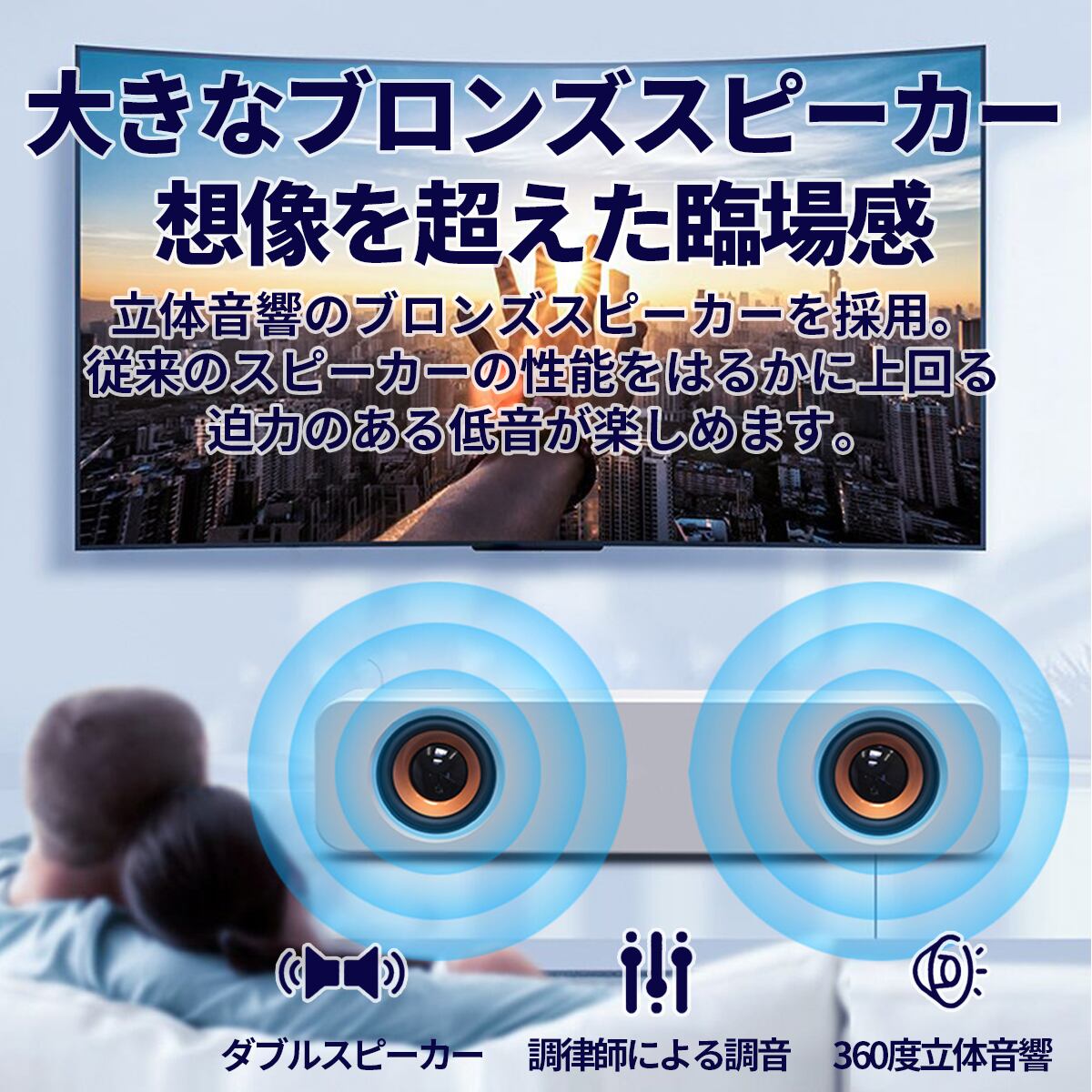 フルレンジブロンズスピーカー、ダブルフルレンジスピーカー+ダブル低音サウンドホールで、360°包み込む4D立体音響のシアター級の迫力あるサウンドをお楽しみいただけます。