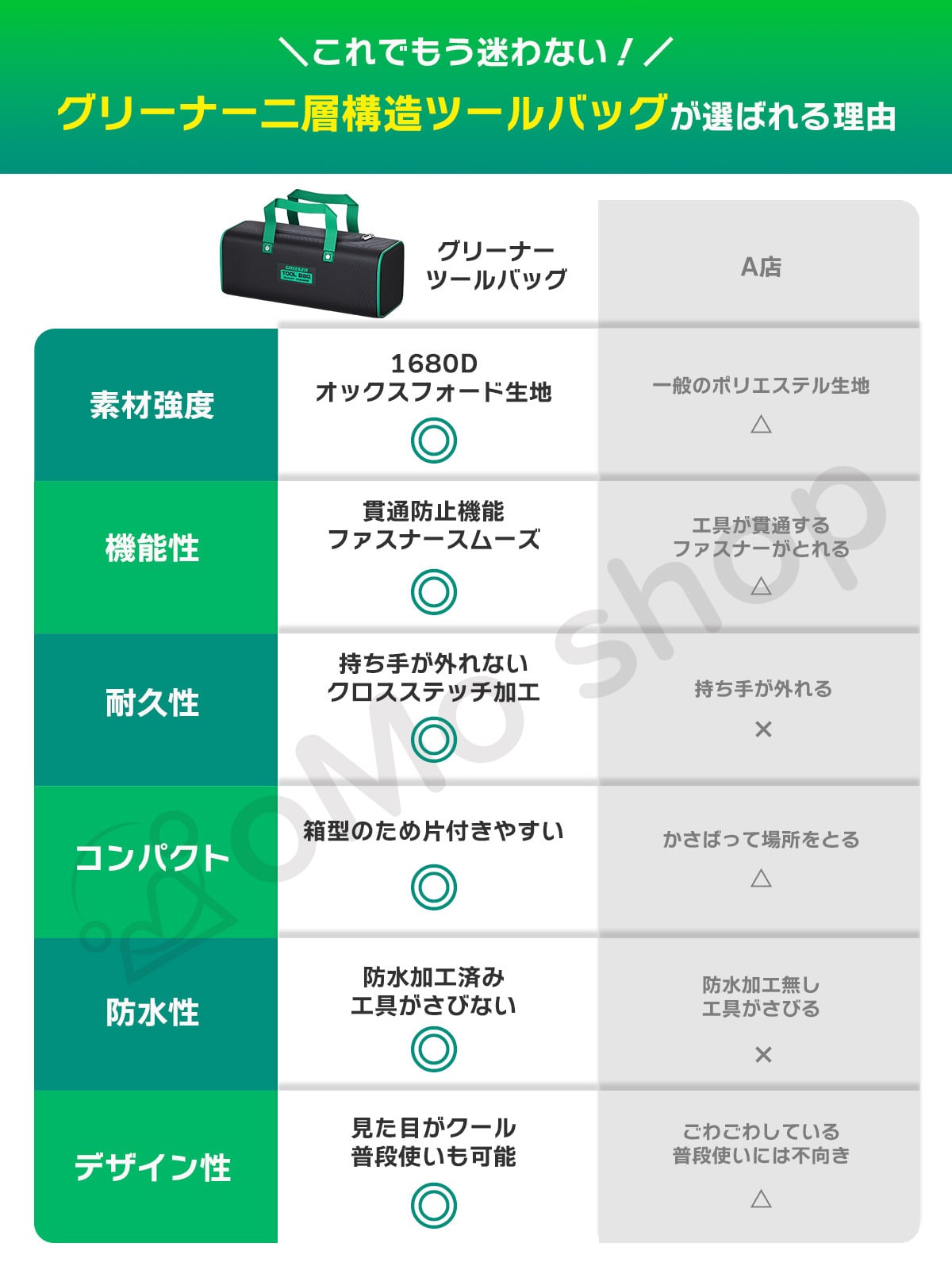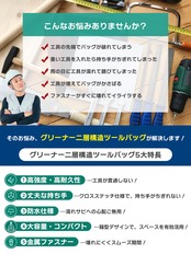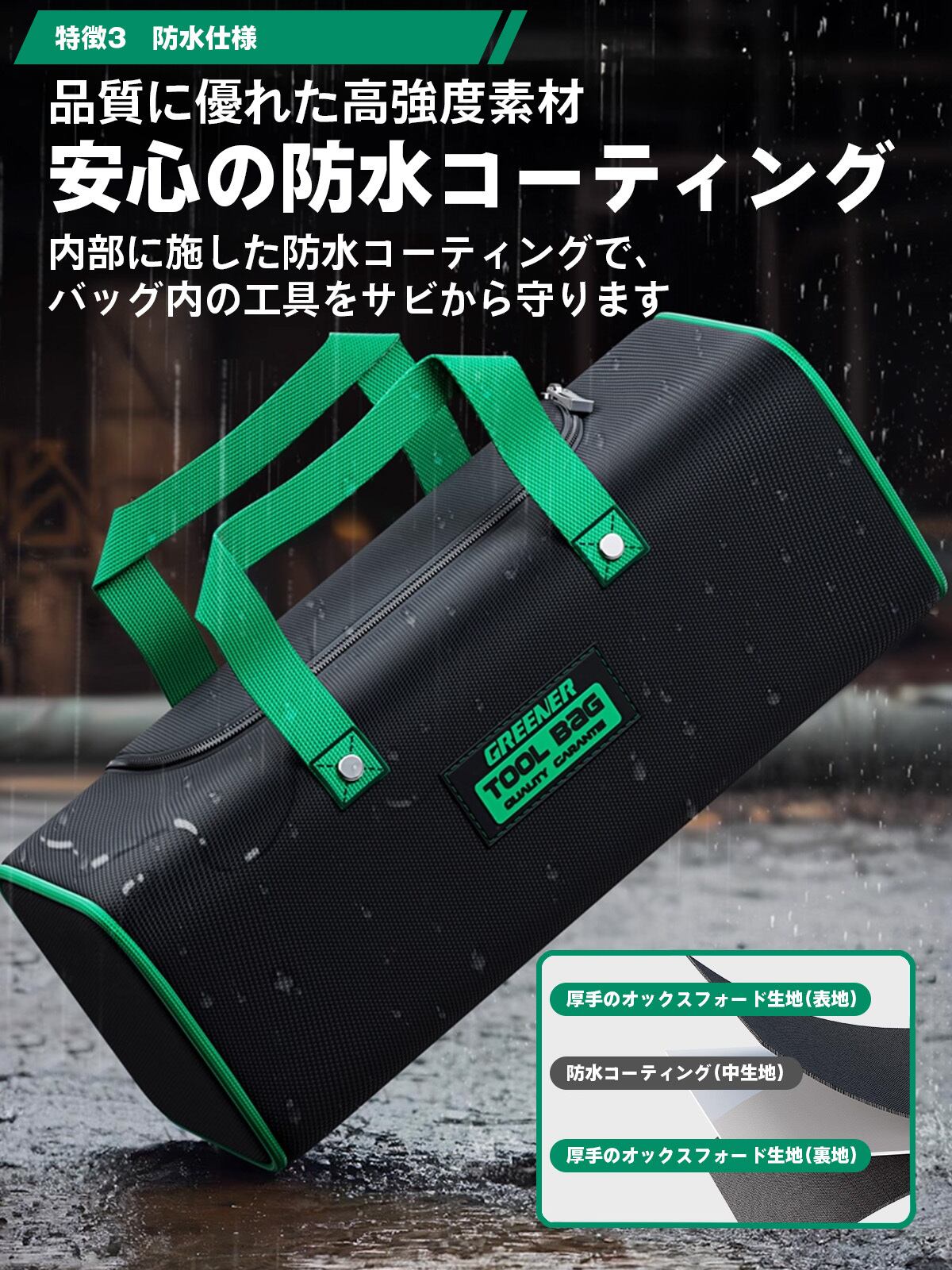 ・防水仕様:内部に防水コーティングが施されており、バッグ内の工具を錆から守ります。