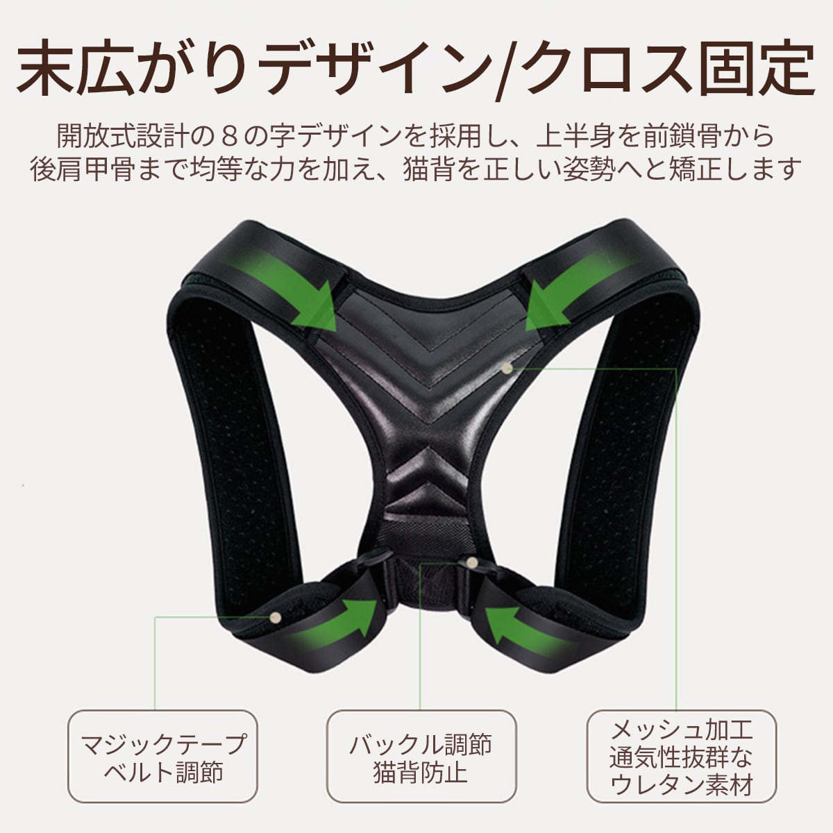 開放式設計の末広がりデザインを採用しクロス固定だから、鎖骨から 肩甲骨 まで均等な力を加えるため、正しい姿勢へと矯正します。