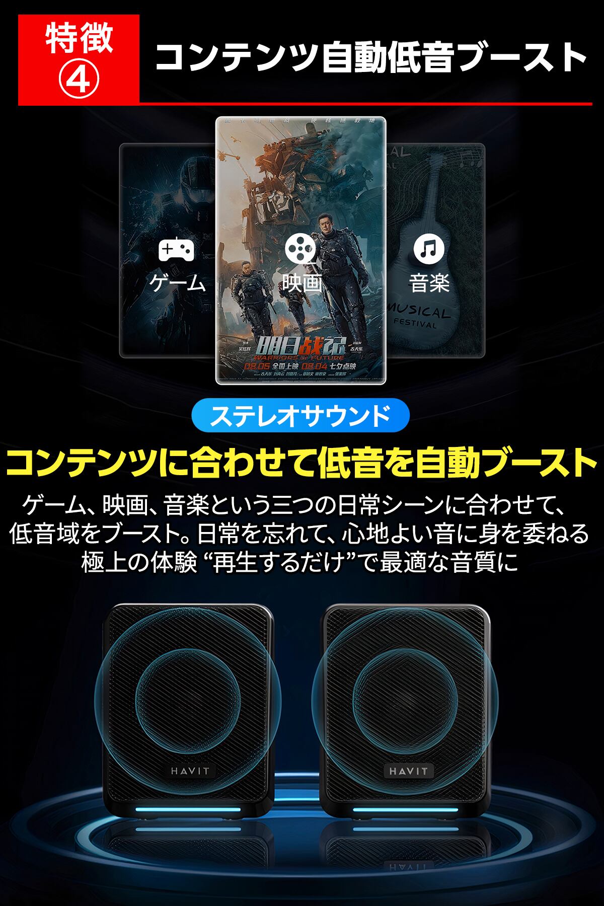 映画・ゲーム・音楽を自動判別し、低音を最適にブースト。
