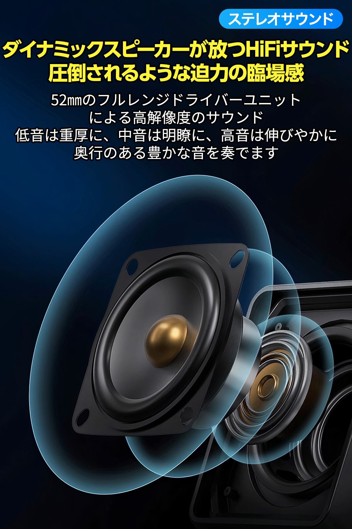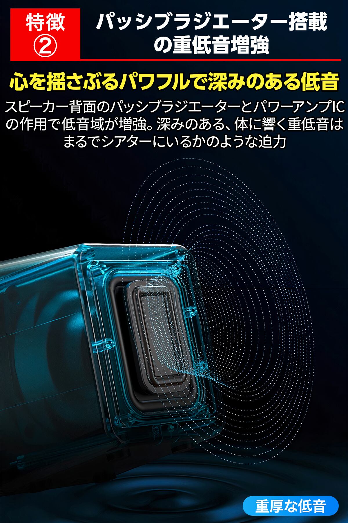 コンパクトサイズながら、身体に響く重低音と解像度の高いクリアサウンドを実現します。