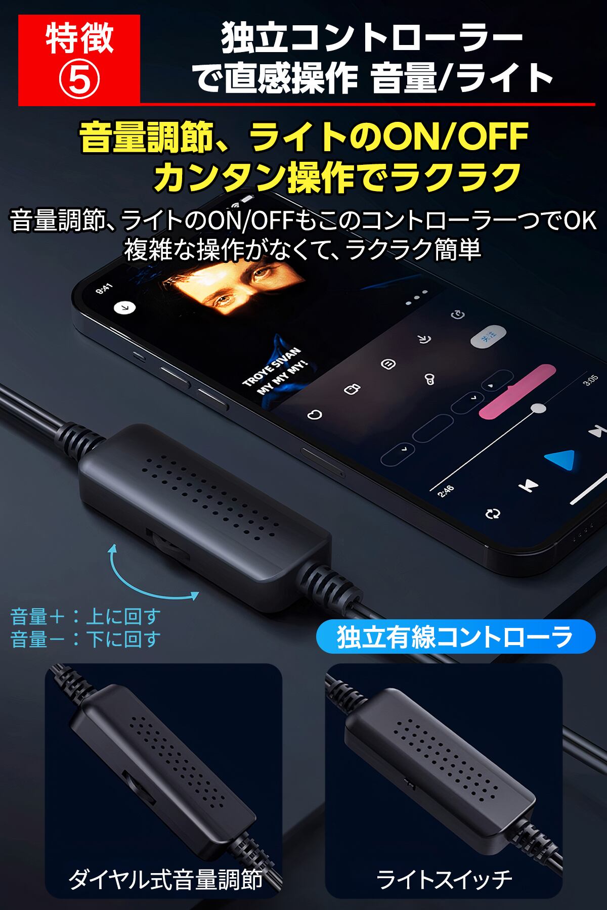 独立有線コントローラーで音量操作が簡単