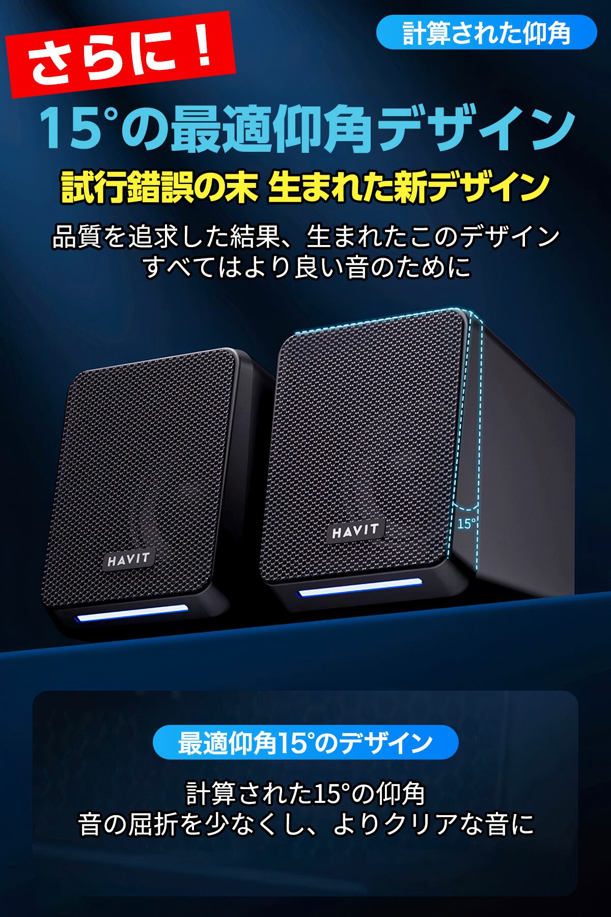 15°仰角設計で音を耳元へ的確に届ける