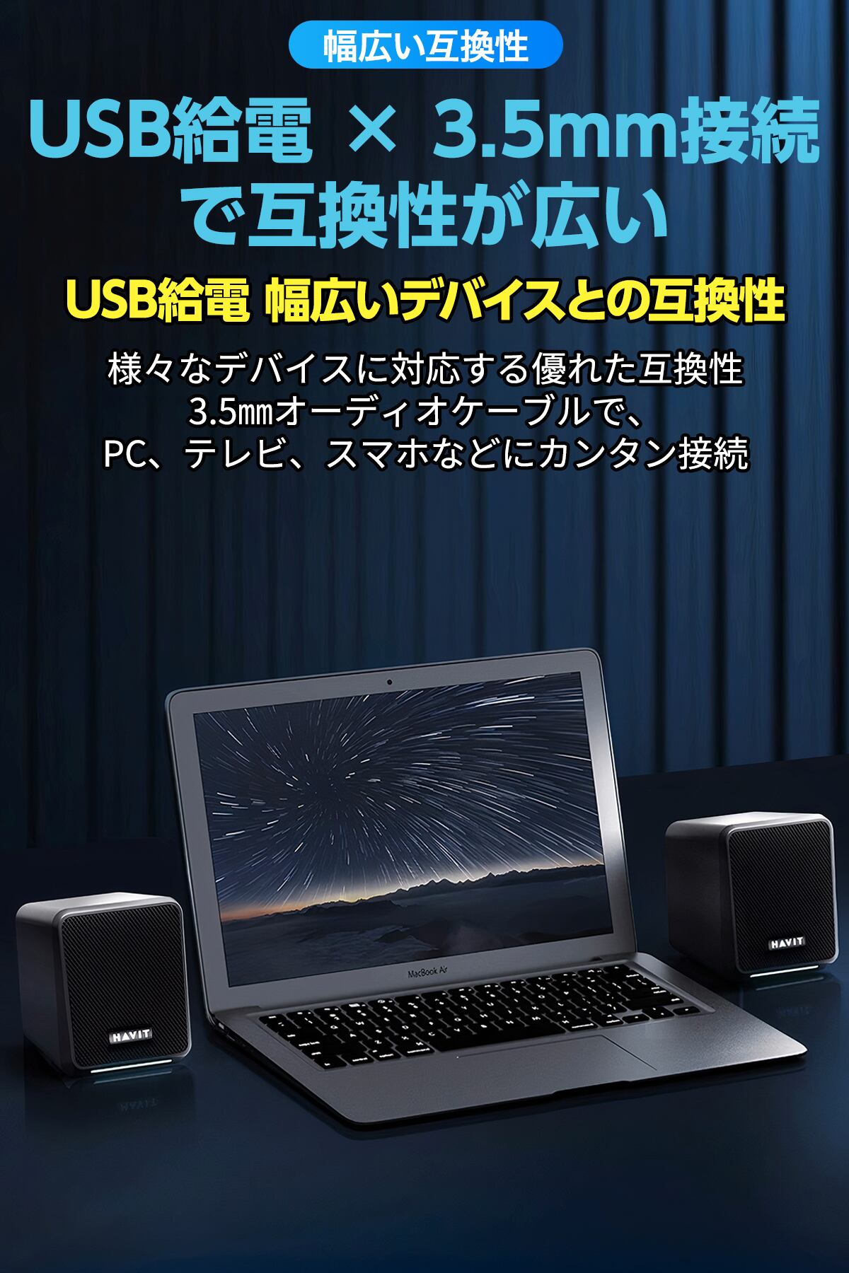 ※ご使用にはUSB給電と3.5mm音声ケーブルの同時接続が必要です。